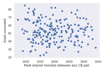Again we see Liverpool making a joke of this metric in 2018/19 with them also having the best defence last season. It’s probably also testament to how solid a defender van Dijk is such that it doesn’t really matter whether he has a consistent partner or not. With 81 goals conceded, Fulham really should’ve invested in more than just Le Marchand and Ream sharing 1113 min on the pitch. However, we also start to see more that a consistent defensive pairing can only take you that far, with Huddersfield, Cardiff, West Brom and Swansea all getting relegated over the last 2 seasons despite scoring high in this metric. Finally, just for fun, I decided to see what plotting goals conceded vs shared minutes would look like: