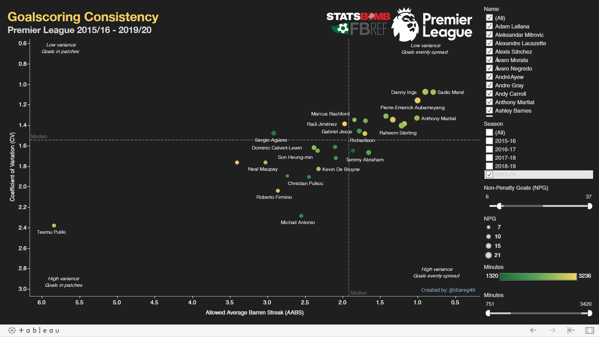 Obviously the Player B scenario is extremely unlikely to happen (I wonder what’s the closest there has historically been though), but it illustrates how the CV alone can be insufficient. Both players have the same distribution of 19 0-goal games and 19 1-goal games and hence the same CV, but surely we can agree that Player A was the more consistent and reliable goalscorer throughout the season? To handle such potential pitfalls, I’ve suggested the following metric that’s clumsily named Allowed Average Barren Streak (AABS). The latter third of this metric is simple. Barren streaks are simply consecutive games with zero goals, hence for Player A his streaks are all 1-game long and so ABS = 1. As for Player B, his ABS = 19 and once again the lower score is better here.